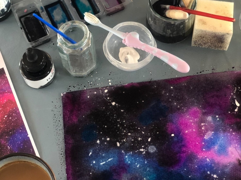 I skal både eksperimentere med flydende akvarel i sort, sølv og pink og lave flotte galaksebilleder med hjælp fra både akrylmaling og tandbørster.